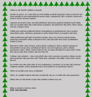 Obecní úřad bude uzavřen od 22. prosince 2025 do 2. ledna 2026 z důvodu čerpání řádné dovolené. V případě naléhavých záležitostí se můžete obrátit na starostku Ing. Danu Lesak nebo místostarostu Vladimíra-Bohuslava Kuchynku.