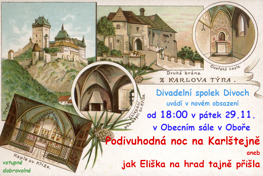 - V pátek 29. listopadu 2019 v 18,00 hod nám již tradičně zahrají v sále divadlo stříbrští Divoši. Tentokrát nám představí hru, která je obnovenou reprízou v novém obsazení