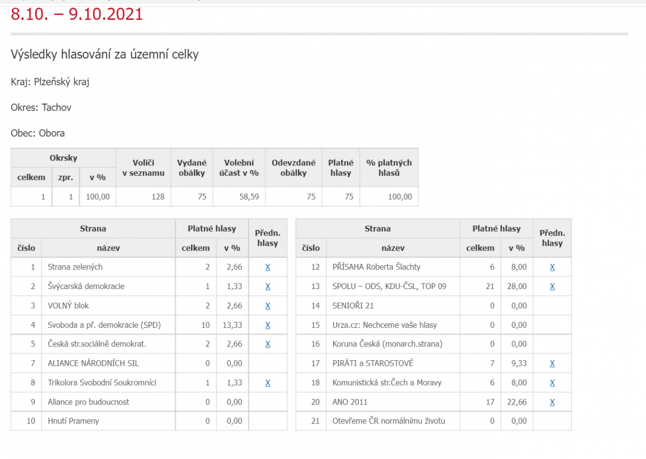 OBORA - Volby do Poslanecké sněmovny Parlamentu České republiky konané ve dnech 8.10. – 9.10.2021 - výsledky